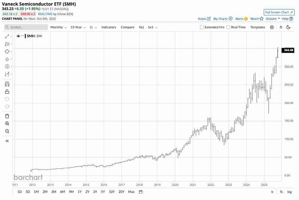 A diversified approach through the VanEck Semiconductor ETF (SMH) provides exposure to sector-wide momentum while reducing single-stock event risk. SMH holds positions across leading semiconductor companies, trading over 8.3 million shares daily with $33.25 billion in assets under management.