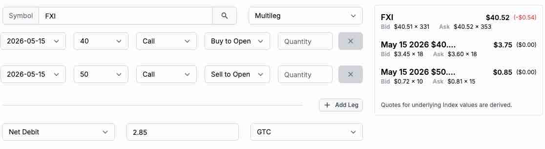 The May 15, 2026, FXI $40-$50 vertical bull call spread at $2.85 has a risk-reward ratio of better than 1:2.5.