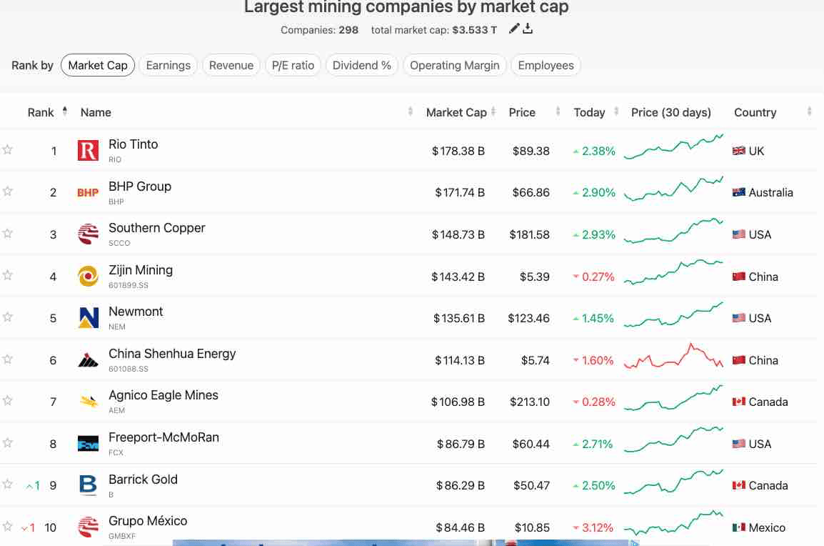 Most of the leading copper mining companies also produce other ores, metals, and minerals.