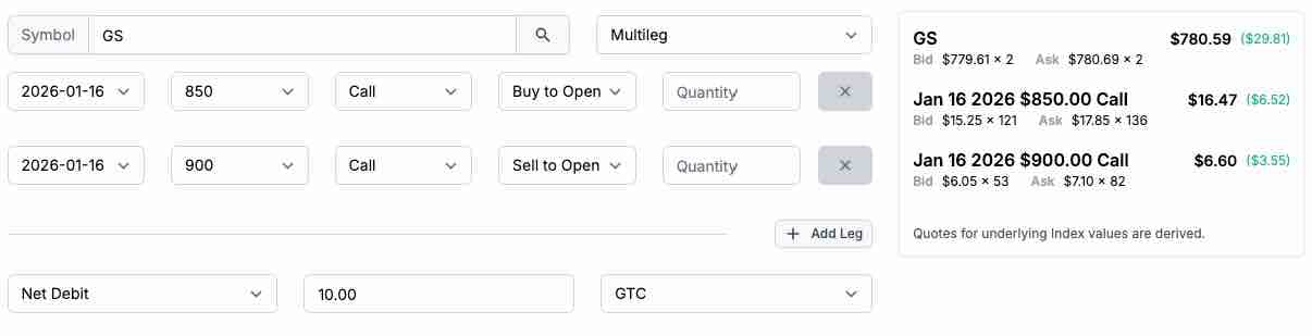 Management Plan: Exit at 50% loss, roll up, or take profits if GS’s price reaches $880 per share or higher before January 16, 2026.