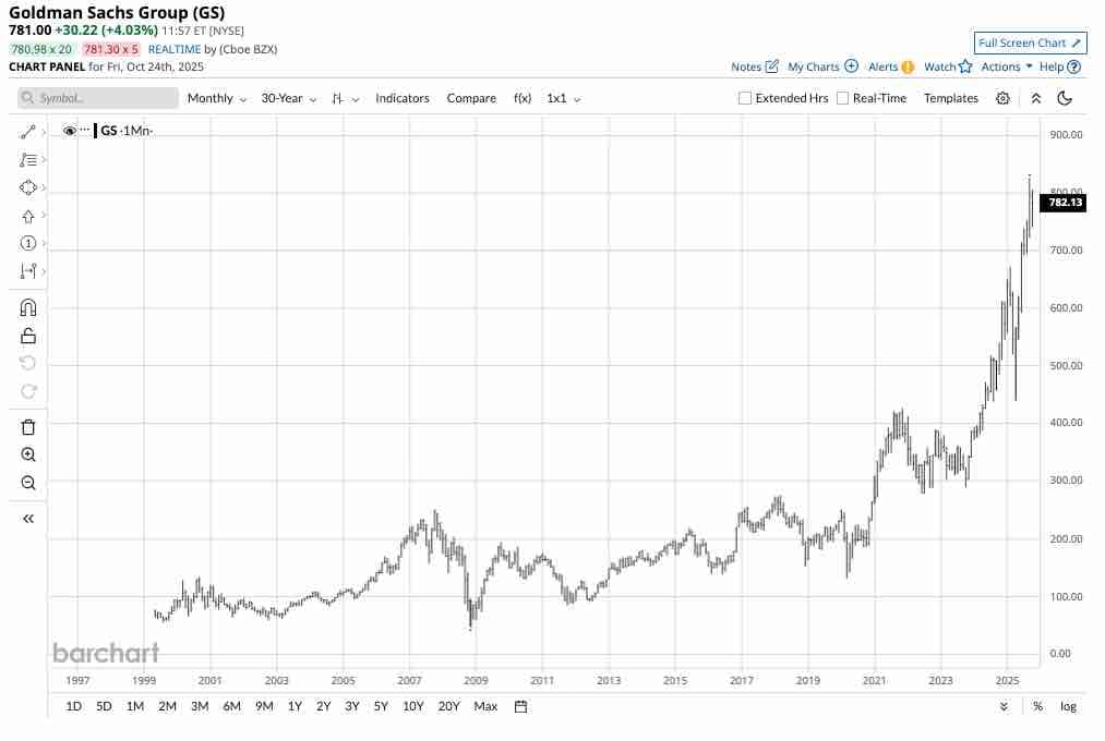 As the chart highlights, GS traded to a record high of over $825 per share in September 2025. At the $781 level, the stock is $44 below its high, with prospects for M&A revenue growth. The January 16, 2026, $850-$900 GS vertical bull call spread at $10 or lower has a risk-reward ratio of at least 1:4.00.