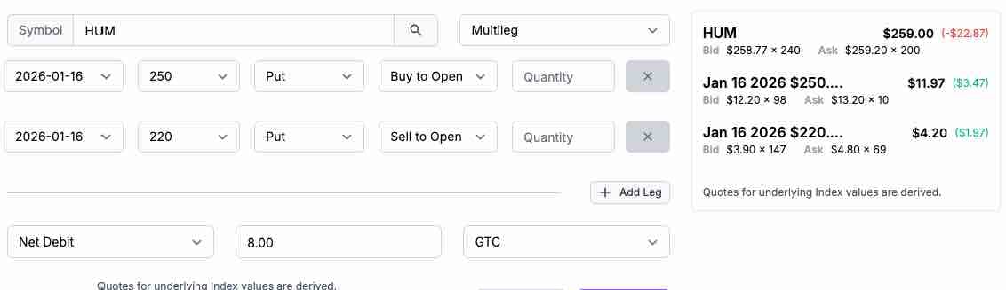 Management Plan: Exit at 50% loss, roll down, or take profits if HUM’s price reaches $220.