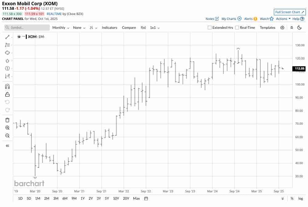 As the chart highlights, XOM rose from its pandemic-inspired low of $30.11 per share in March 2020 to the most recent high of $126.34 in October 2024. XOM shares have been trading in a range of approximately $100 to $120 over the past three years.
