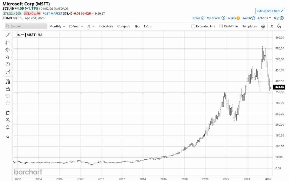 The monthly chart highlights MSFT’s 35.8% decline from its July 2025 record high of $555.45 to its March 2026 low of $356.28 per share.