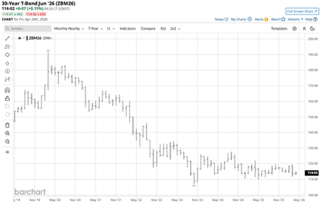After plunging 44.1% from 191-22 in March 2020 to 107-04 in October 2023, the 30-Year U.S. Treasury bond or long bond futures contract has traded in a narrow range between 108-19 and 127-22 since November 2023.