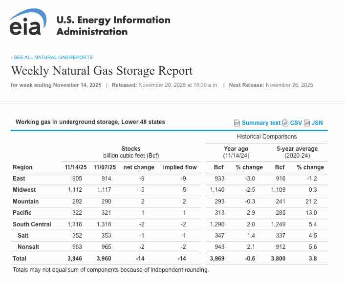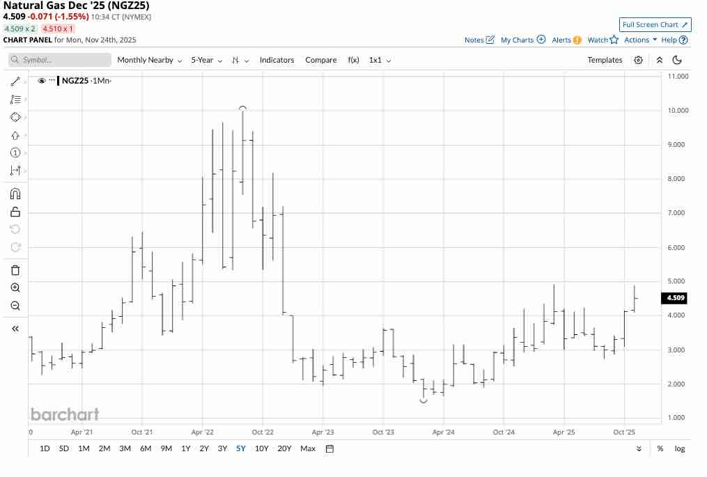 In November 2025, natural gas traded in a $4.087 to $4.881 range. In November 2024, the trading range was substantially lower, from $2.514 to $3.639 per MMBtu.