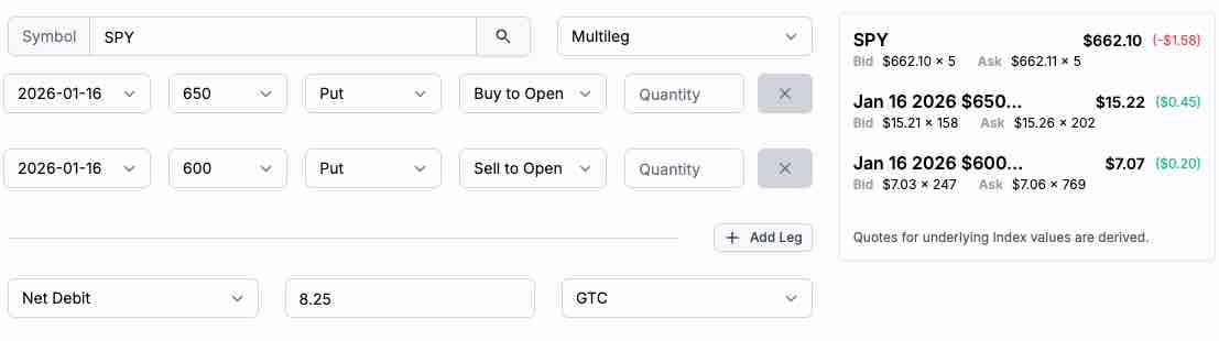 Trade Setup: Buy $650 Put / Sell $600 Put, January 16, 2026, expiration.